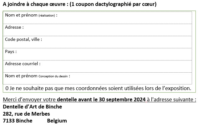 - L’envoi d’un ou plusieurs cœurs à Dentelle d’Art de Binche tient lieu d’acceptation du présent règlement.
