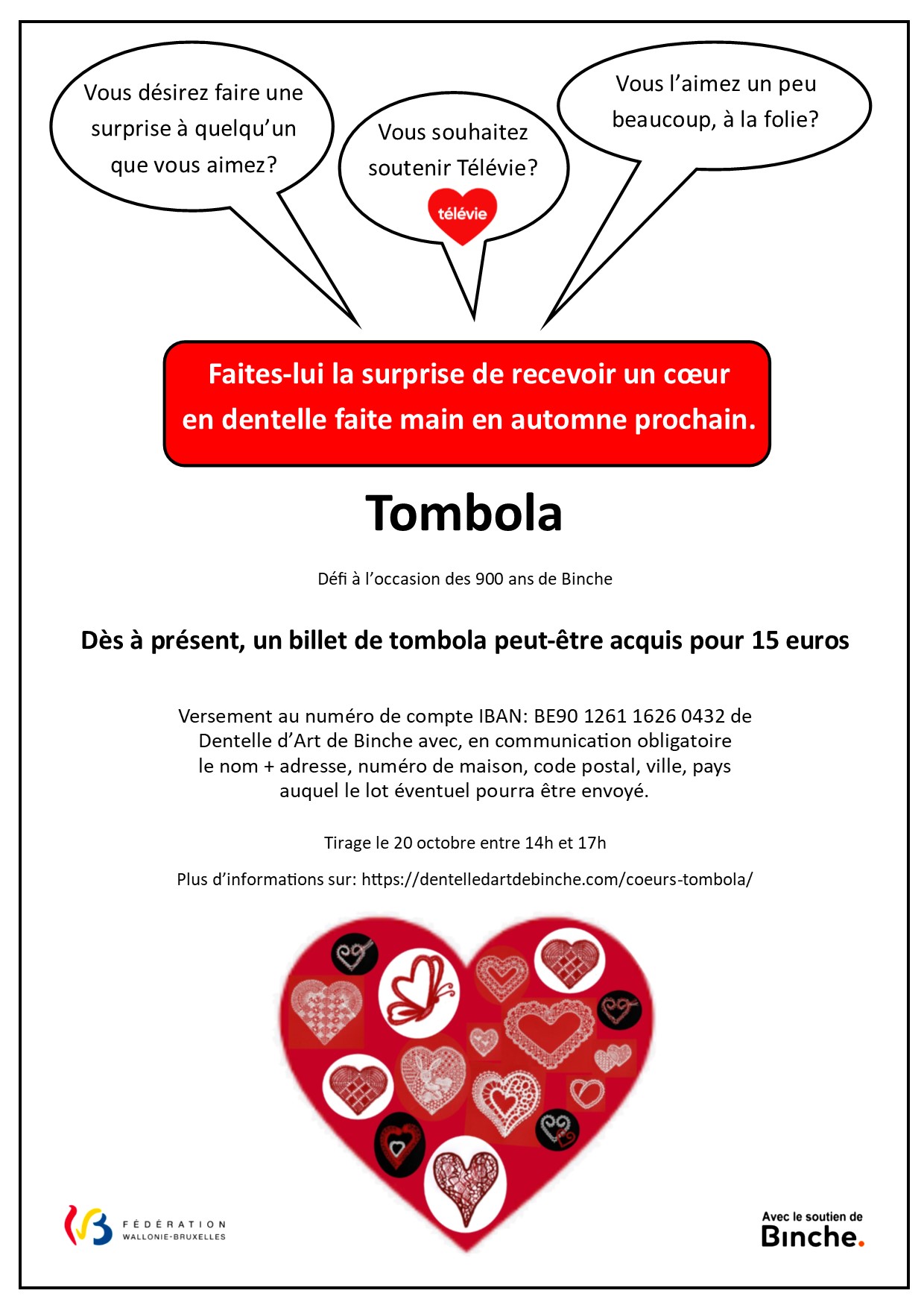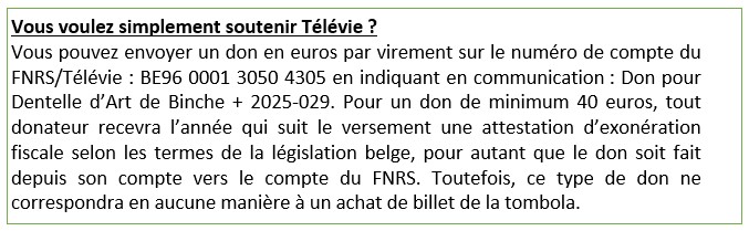 17. Un billet de tombola peut être acquis pour 15 euros par versement au numéro de compte IBAN : BE90 1261 1626 0432 BIC : CPHBBE75 de Dentelle d’Art de Binche avec, en communication obligatoire le nom + adresse, numéro de maison, code postal, ville, pays auquel le lot éventuel pourra être envoyé.